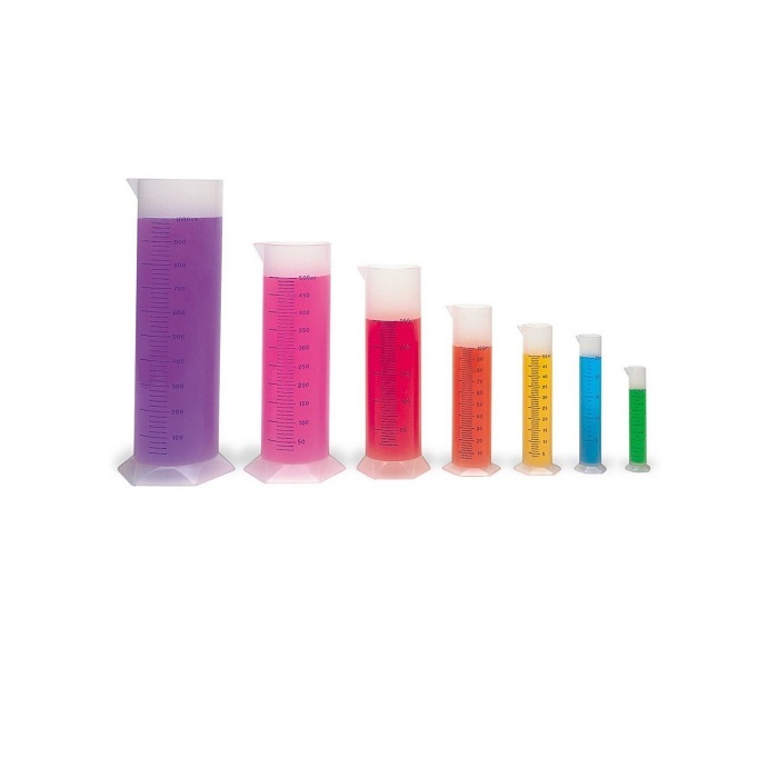 В набор входит 7 устойчивых цилиндрических сосудов из полипропилена, объем: 10, 25, 50, 100, 250, 500 и 1000 мл. Мерные цилиндры с носиком и пластмассовым основанием (ножкой) применяют для отмеривания определенного объема жидкости, на боковой поверхности цилиндра наносится шкала, соответствующая его вместимости.